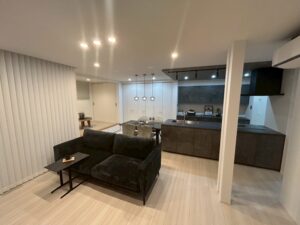 室内はグレーを基調にした落ち着いたデザインで、キッチンやリビングの統一感がとても素敵。