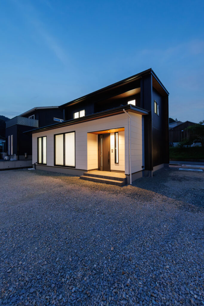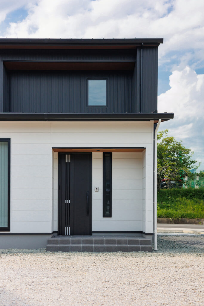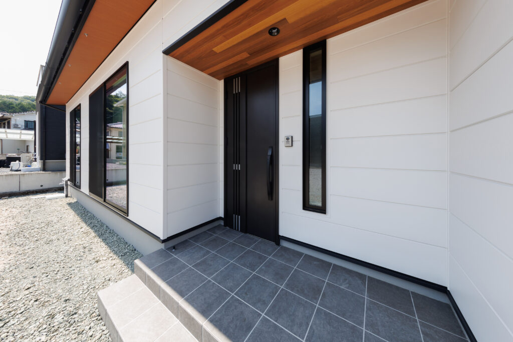 玄関ドアもスタイリッシュにブラックでコーディネート。軒天のレッドシダーとの相性も抜群。