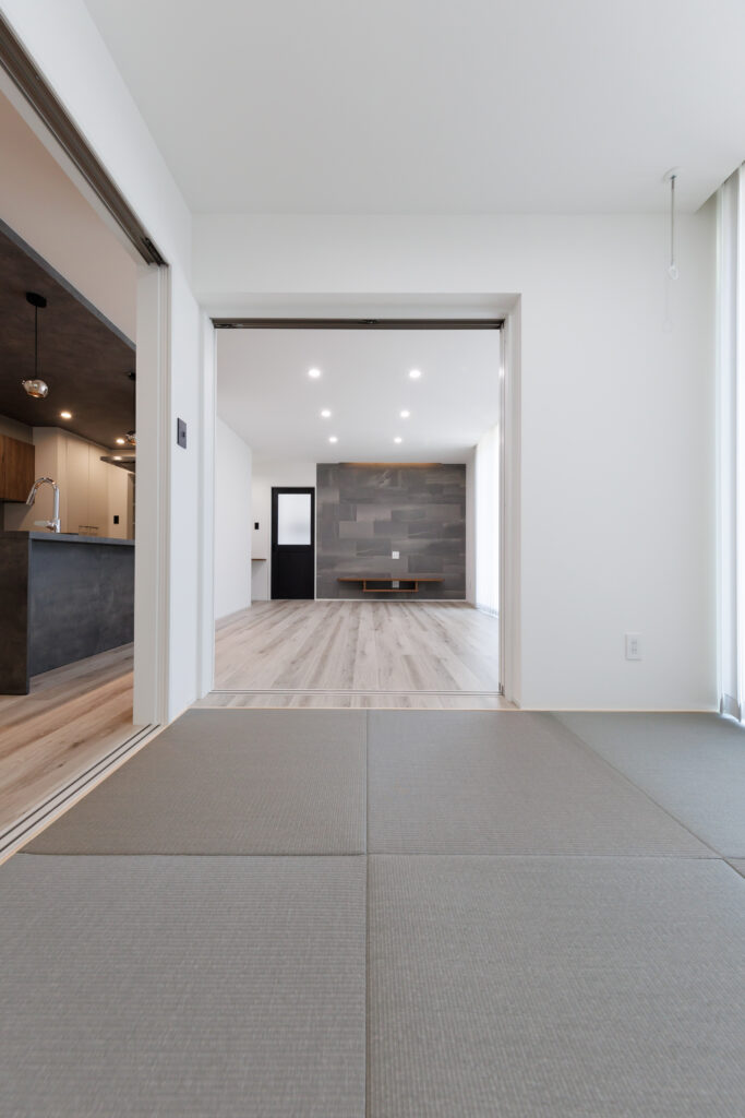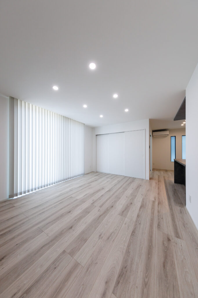 リビングには天井まで届くハイサッシを計画。将来の使用用途が広がる和室も隣接。