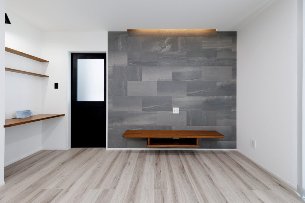 リビングにはSAIKAオリジナルの造作テレビ台。グレーのエコカラットでコーディネート。