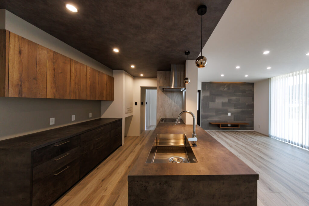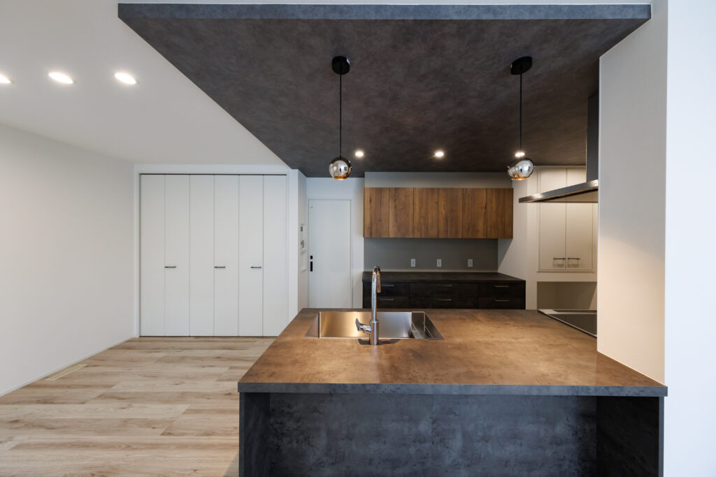 キッチンはSAIKAではおなじみ家具のようなキッチングラフテクトを採用。天井のクロスと合わせてかっこよくデザイン。