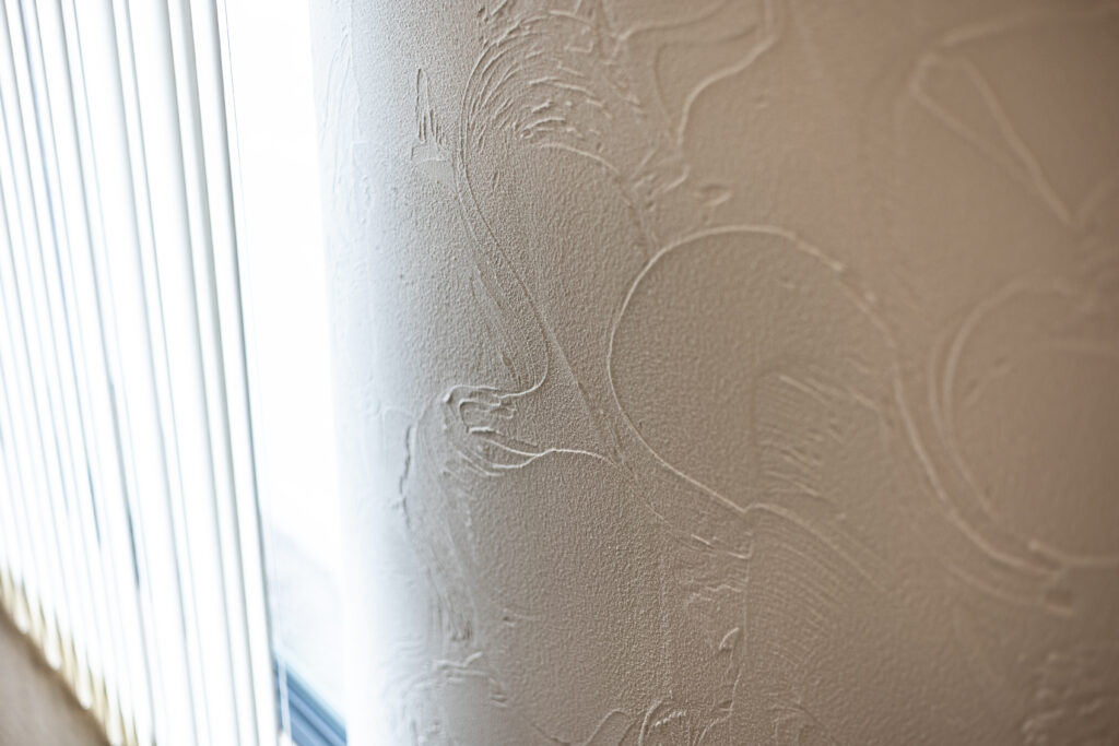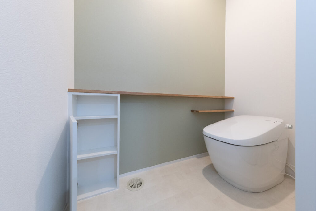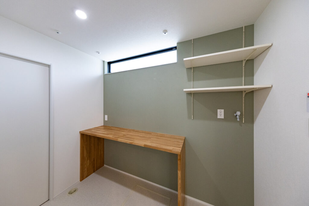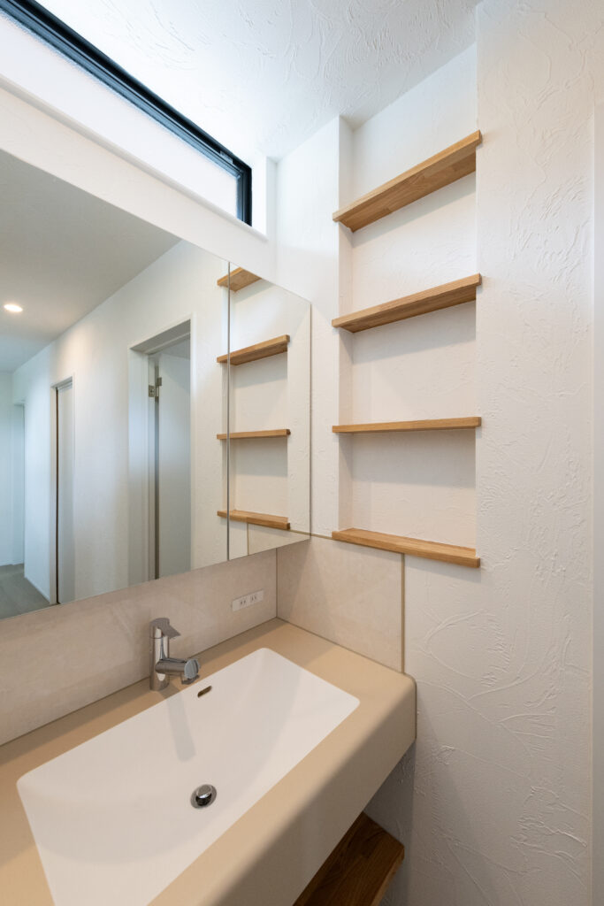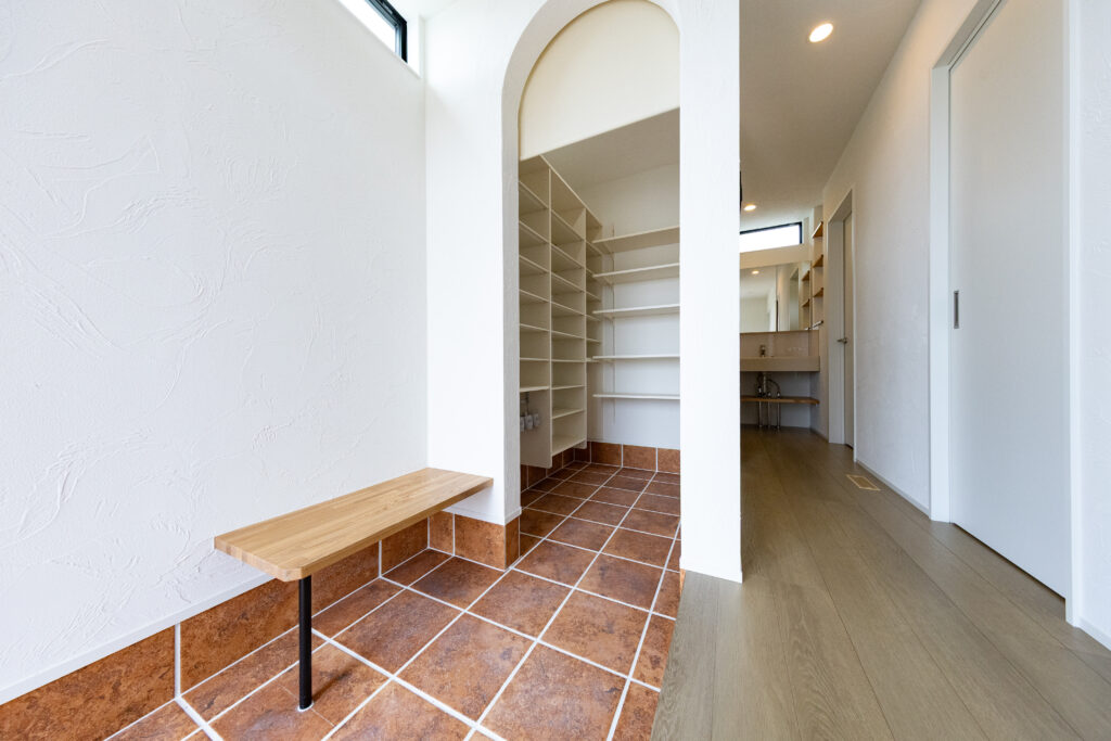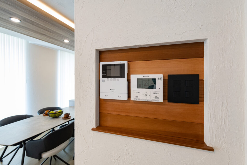 スイッチニッチにはレッドシダーをアクセントに。壁は珪藻土仕上げ。