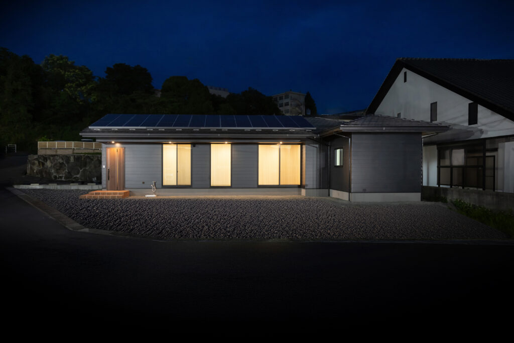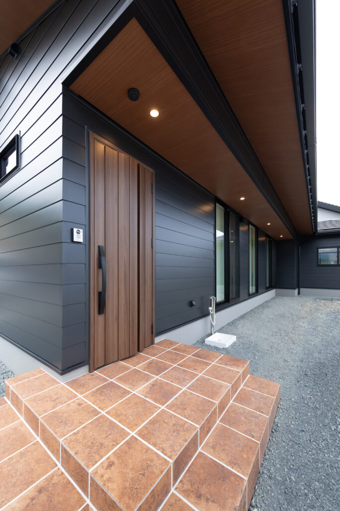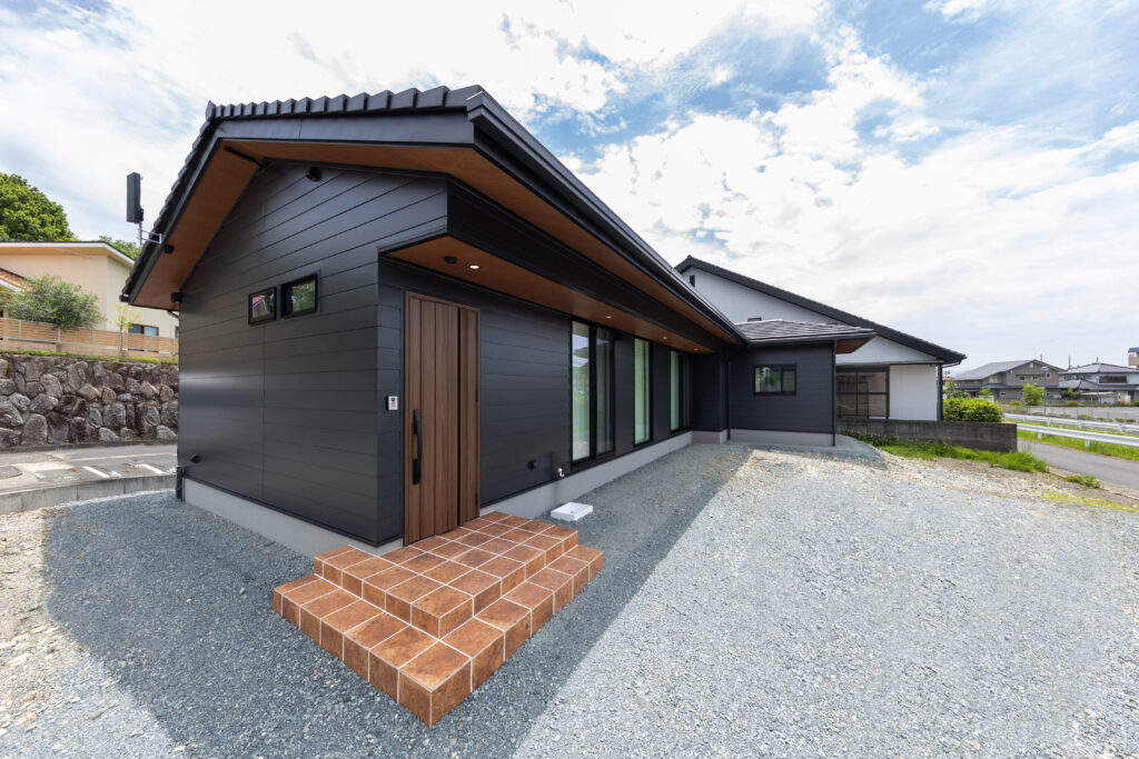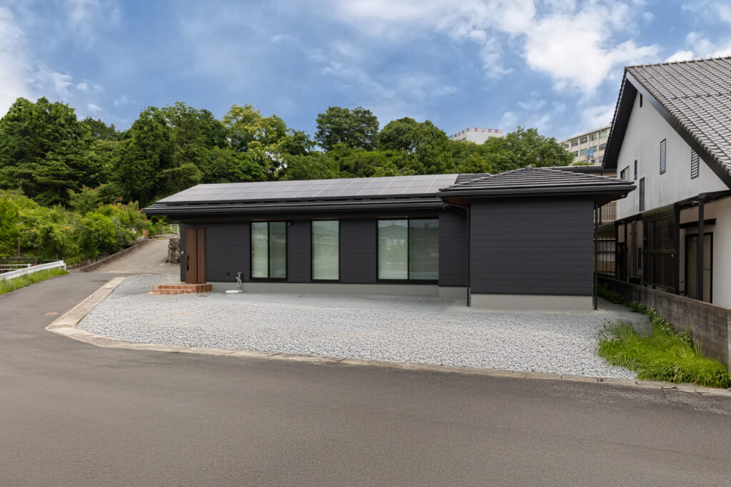 平板瓦とマットブラックの金属サイディングの和モダンの家。