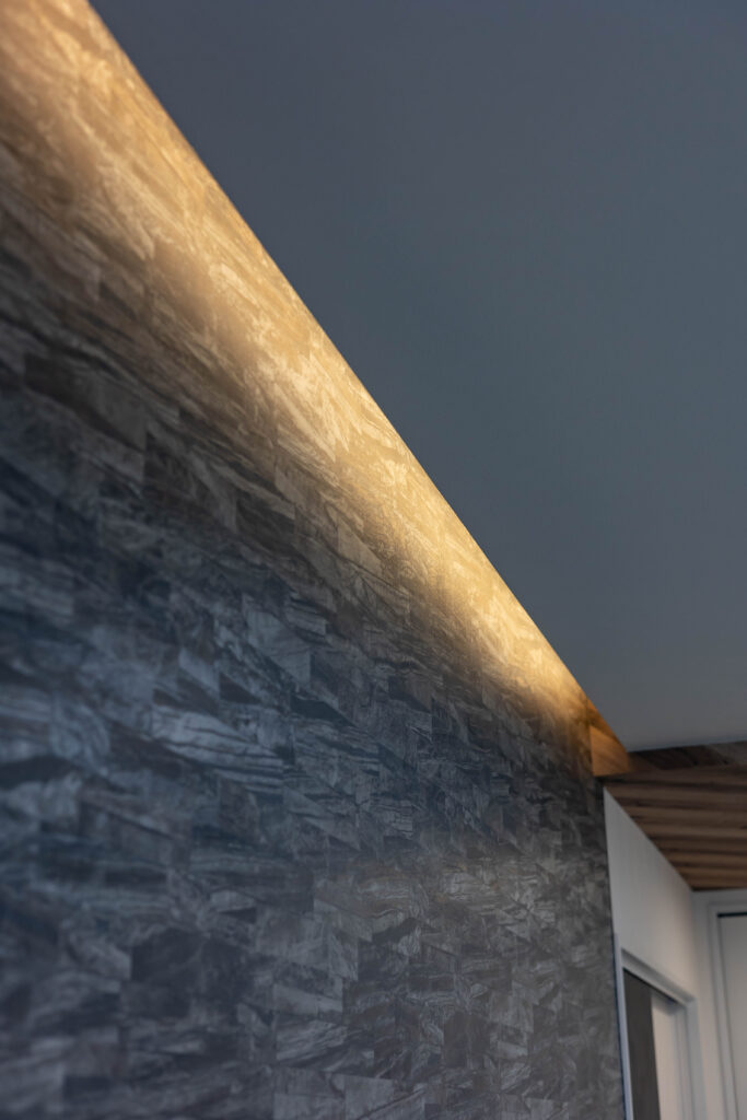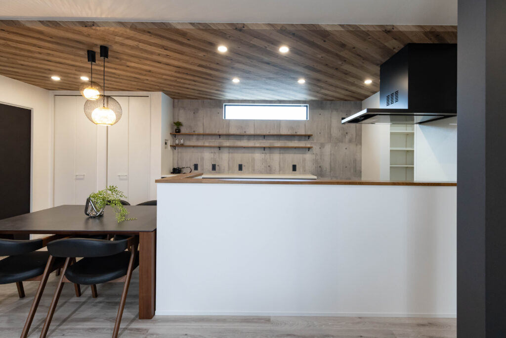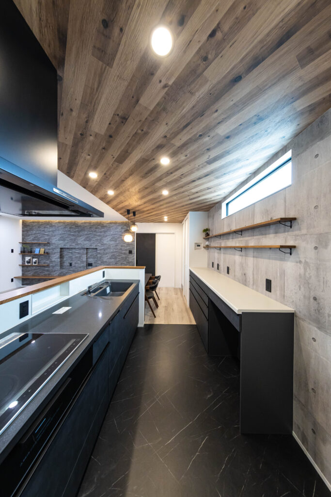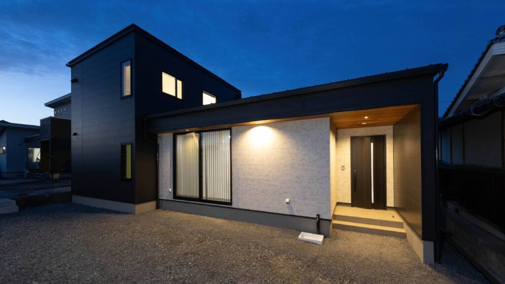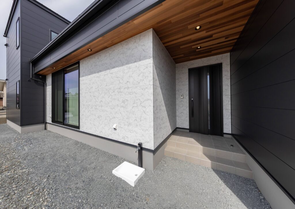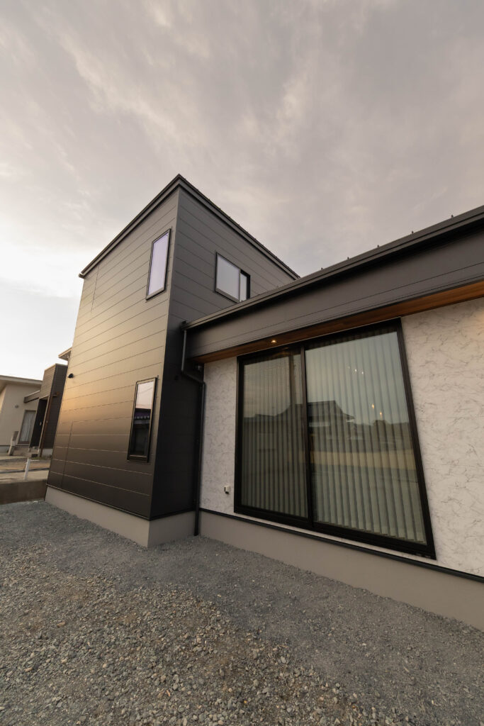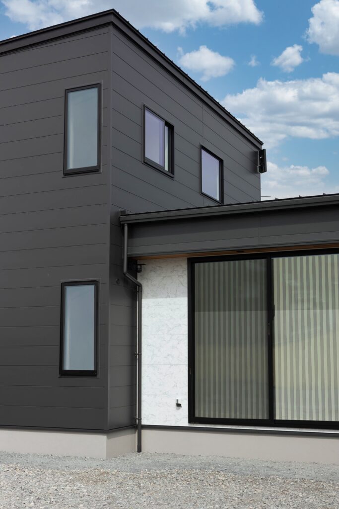 金属サイディングとグレーの窯業系サイディングのスタイリッシュな組み合わせ。