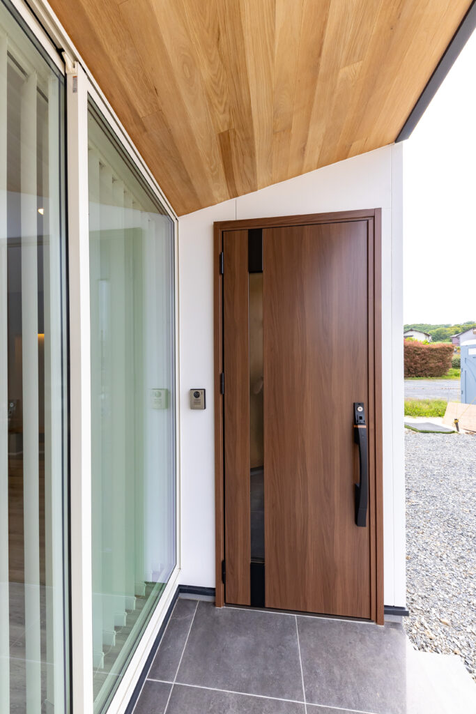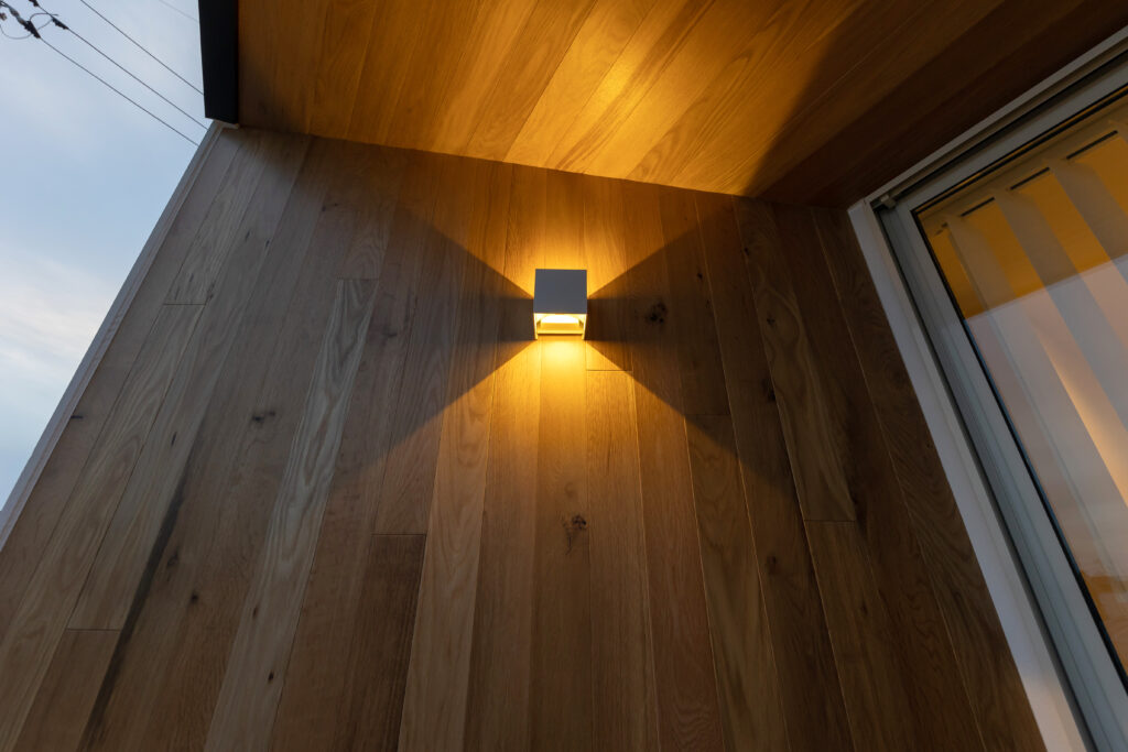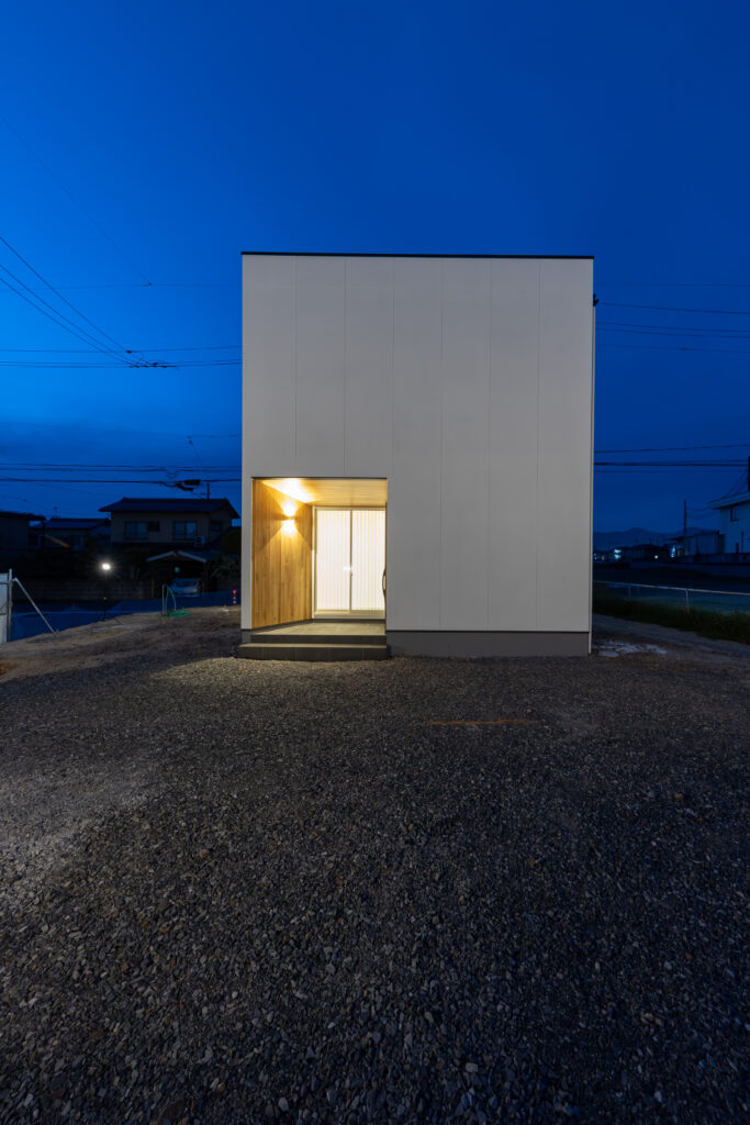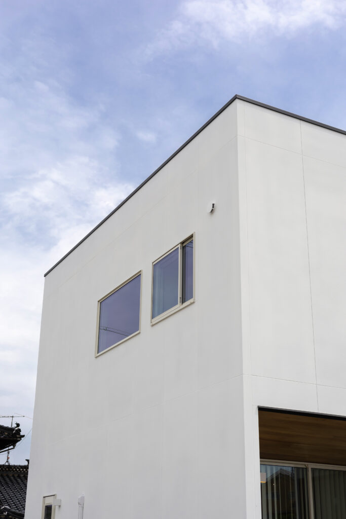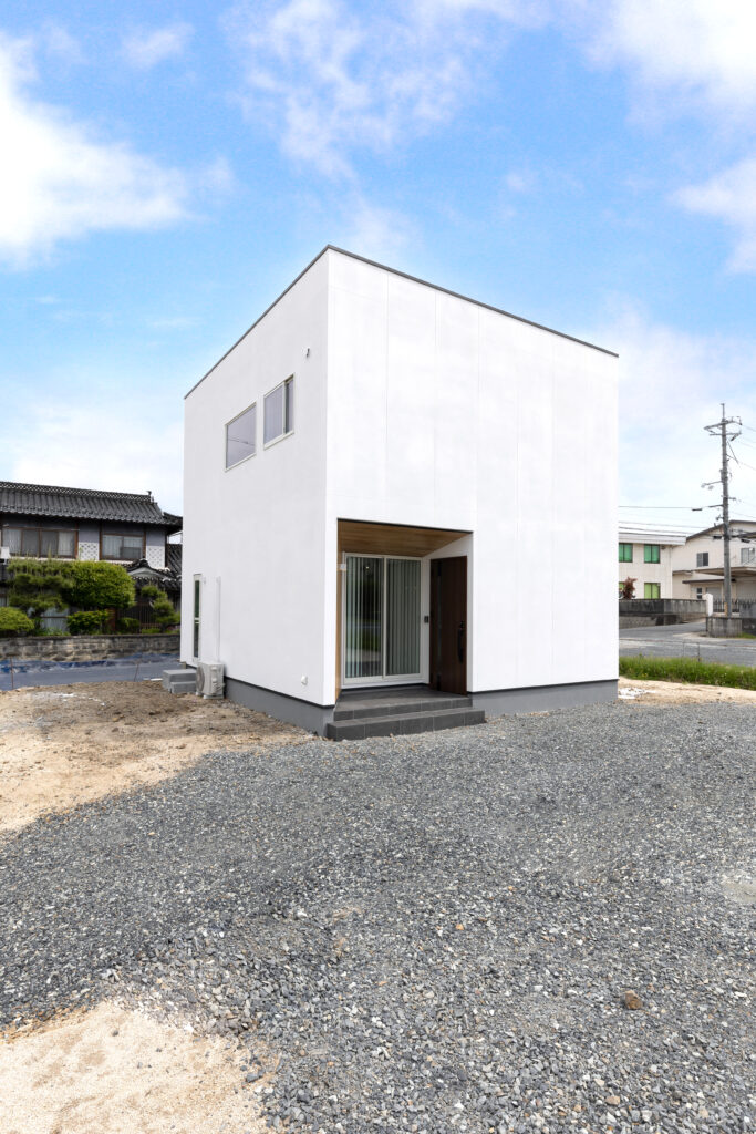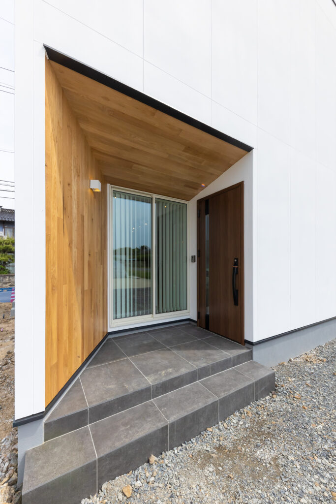 真っ白な四角いシンプルな外観。アクセントに玄関廻りのみ木目をデザイン。