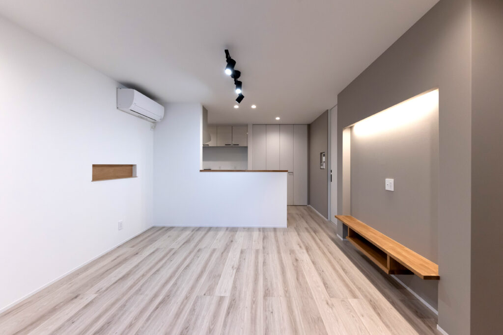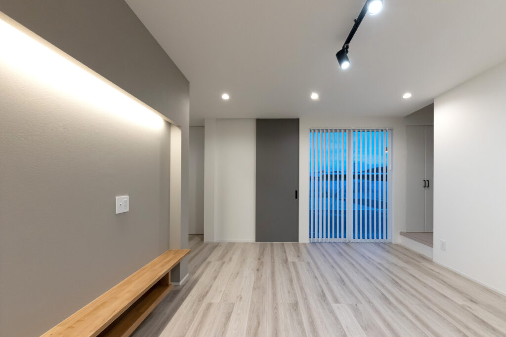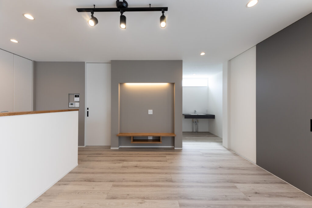 LDKにはダイニングソファを計画。作り付けのテレビ台や間接照明で快適な空間を演出。