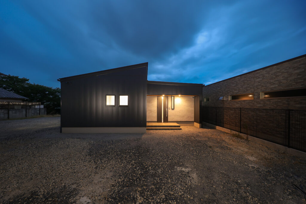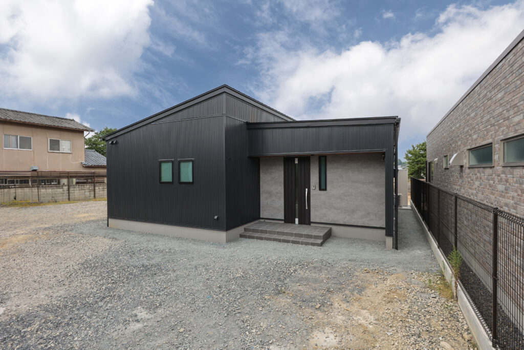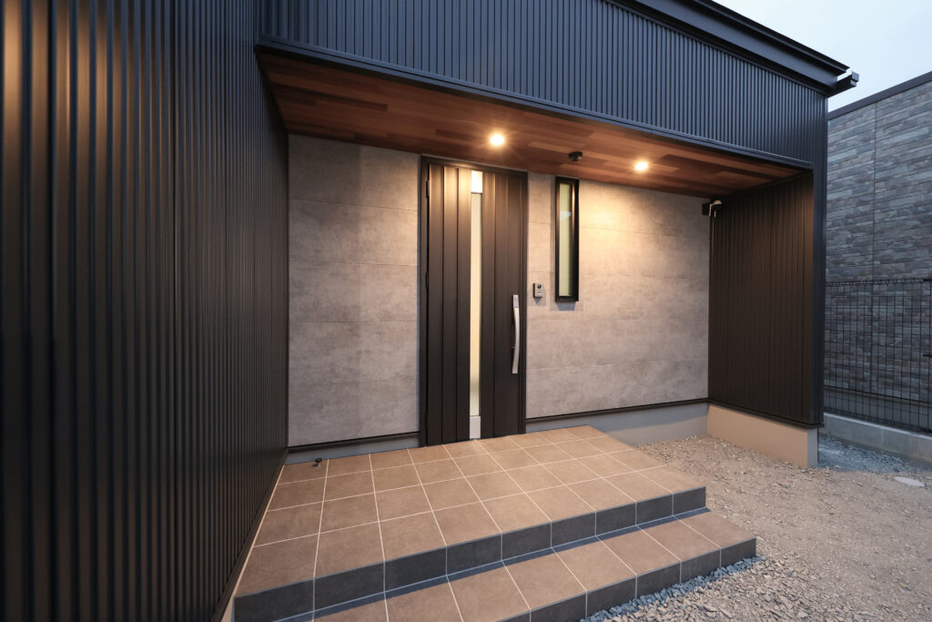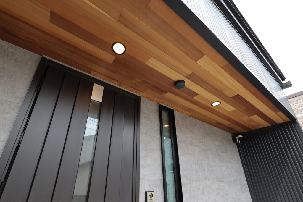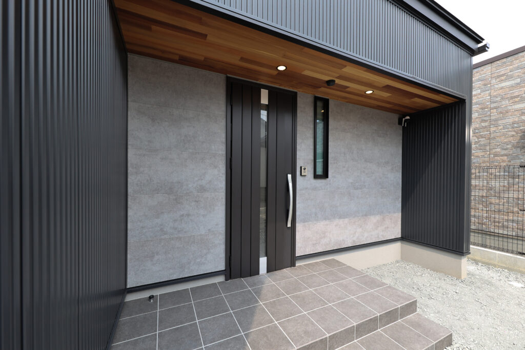 外観はブラックとグレーのシンプルなカラーで統一!玄関ドアの色もブラックにすることで、統一感を持たせています。アクセントに軒天にはレッドシダーを計画。