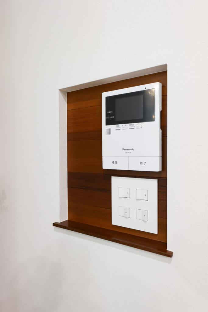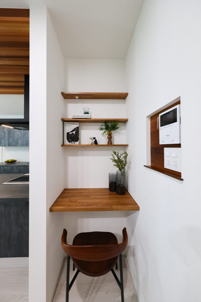 リビングのテレビ面の裏には猫ちゃんのお部屋があります!スイッチニッチにはレッドシダーを設置しおしゃれにデザイン!