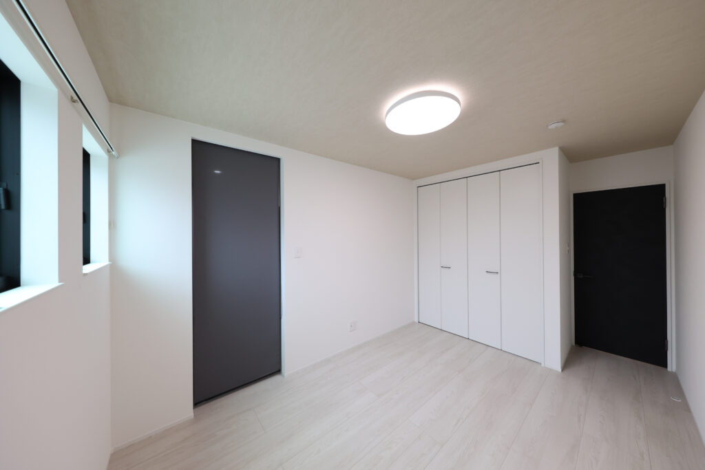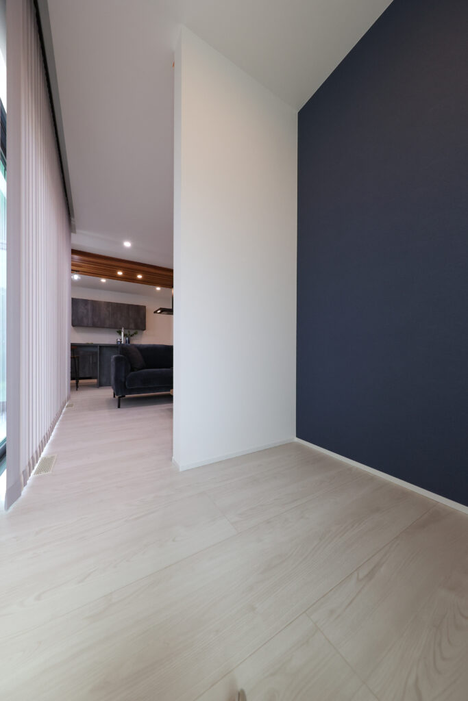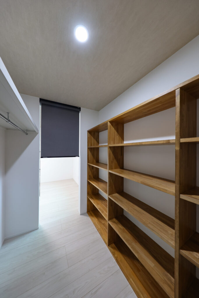洋室のアクセントクロスは壁ではなく天井に配色することで、一味違うおしゃれな雰囲気に。主寝室のウォークインクローゼットの中には書籍を大量に置くことのできる本棚を計画。