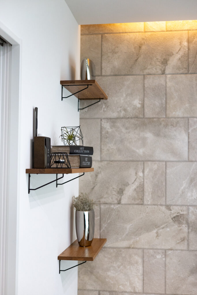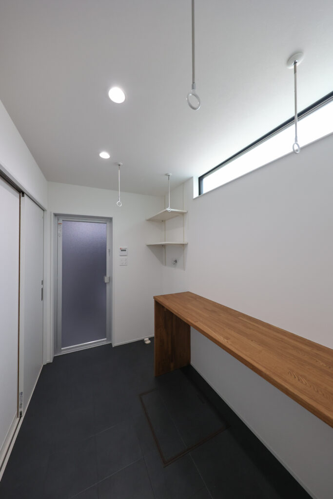 お風呂の壁はグレーでかっこよく!脱衣室はランドリールームも兼ねています!広々造作カウンターで洗濯物をたためます。