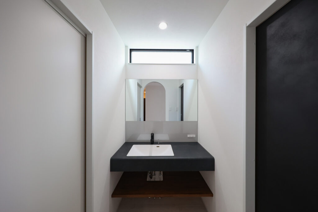 洗面化粧台はおしゃれなアイカ!ランドリールームのすぐ横には通り抜けのできるファミリークロークがあります。たくさんの洋服をしまうことができますよ。
