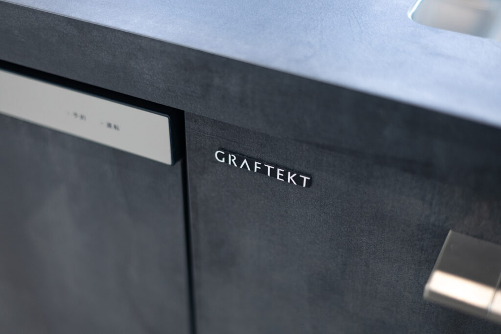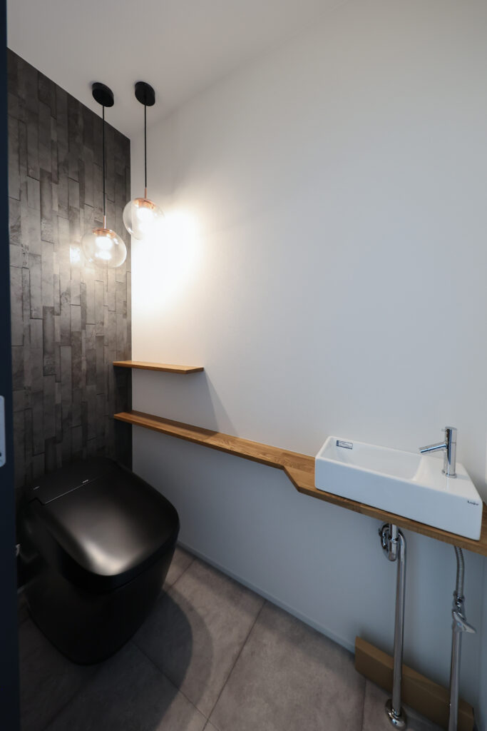トイレには造作カウンターを計画。二段にすることでトイレットペーパーもおけます。キッチンは家具のようなグラフテクト!かっこいいメーカーです。
