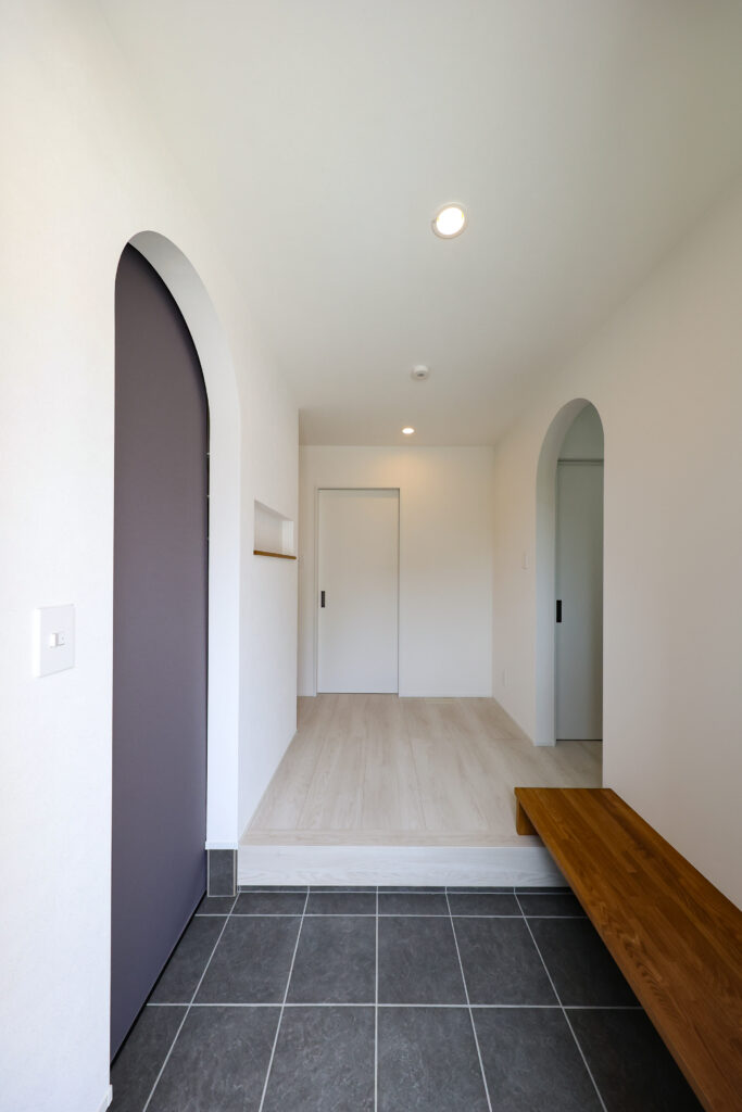 玄関横の土間収納にはアーチの垂れ壁を計画。玄関ニッチには季節の飾りを置けます。そして玄関には造作ベンチを計画!おしゃれな靴も楽々座ってしっかりと履くことができます。