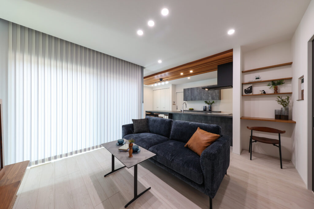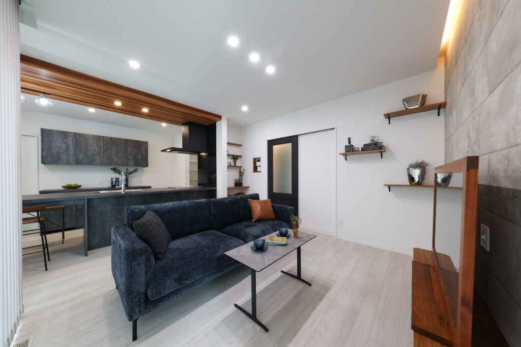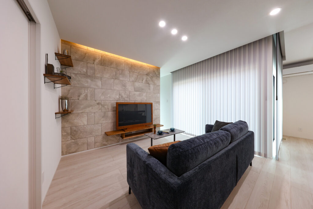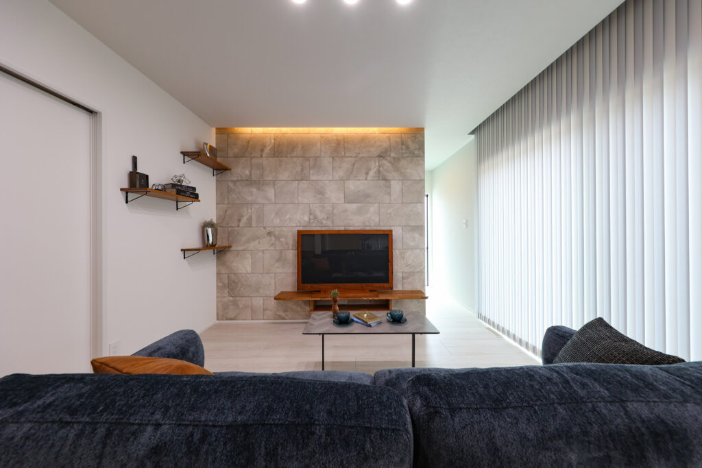 リビングのテレビ面の壁には人気のエコカラットをデザイン!間接照明に照らされておしゃれさを演出。壁面にはキャットタワーにもなる造作棚を計画。