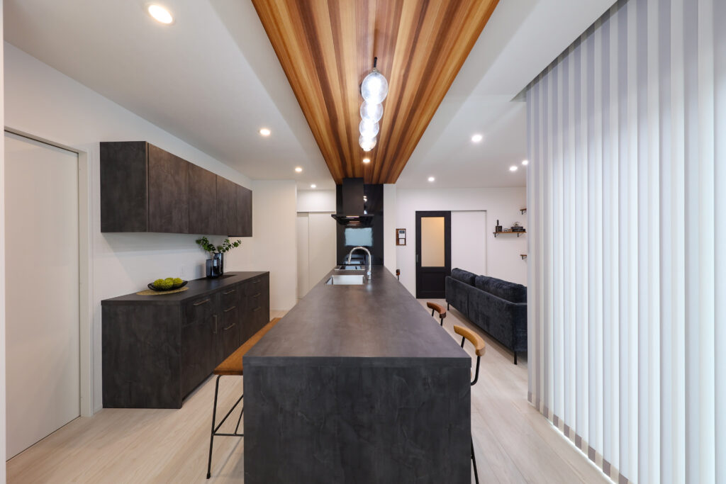 キッチンは珍しいダイニングと一続きの物を採用!これによりとっても長いキッチンスペースが出来上がり!収納もたっぷりです。
