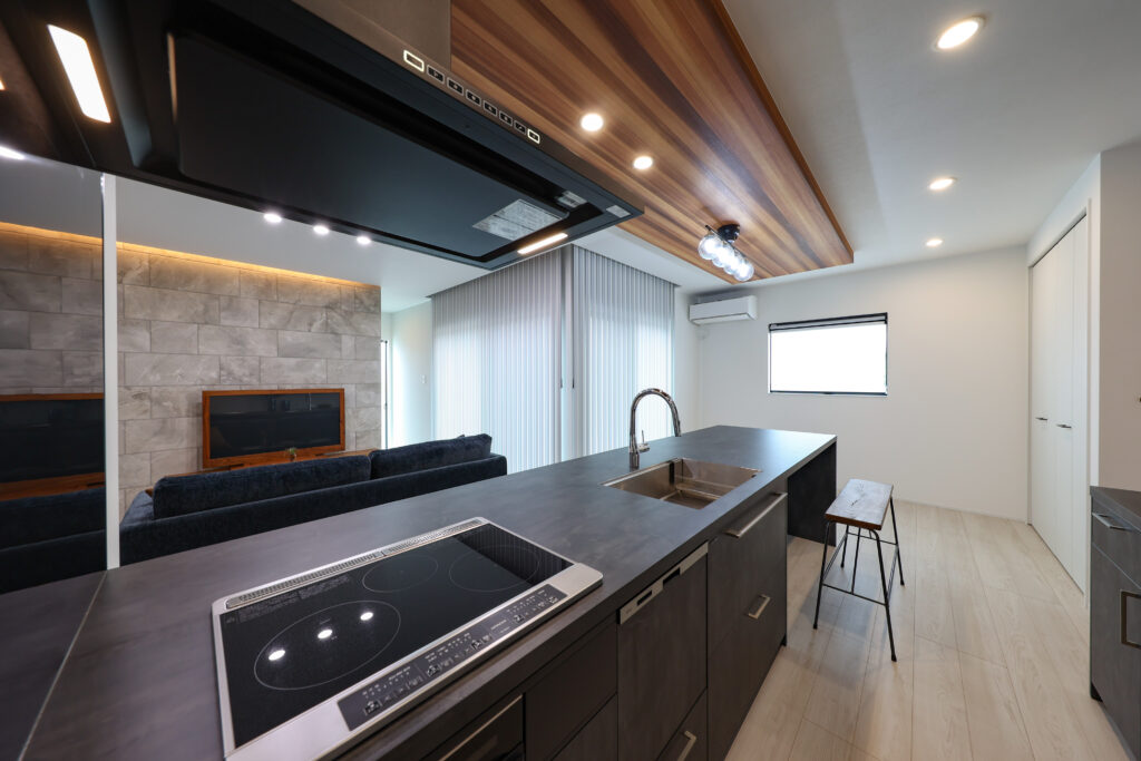 ソファの後ろにキッチンがあるので、料理をしながらテレビを見ることができます。リビングの一角にはスタディーコーナーも!