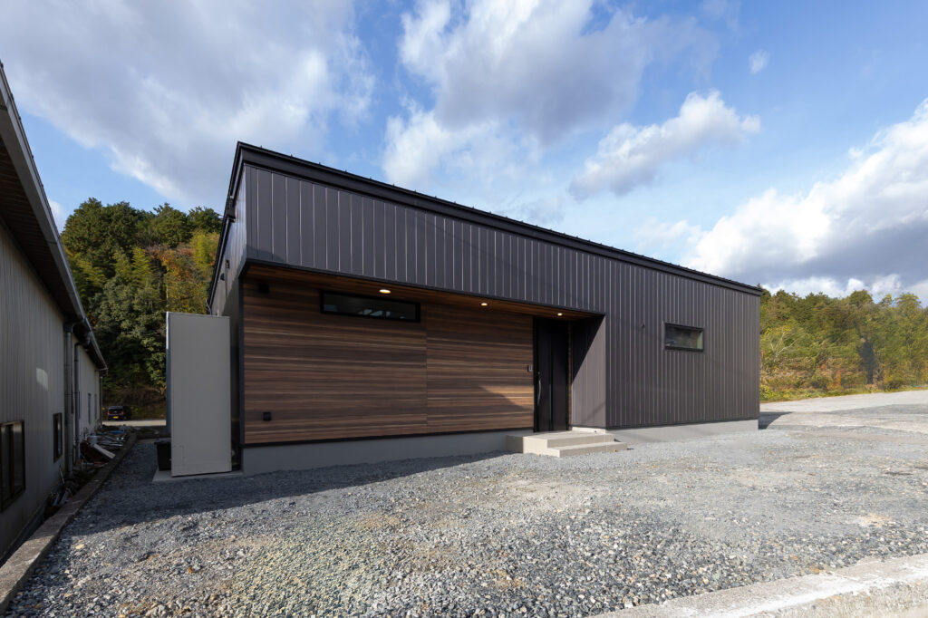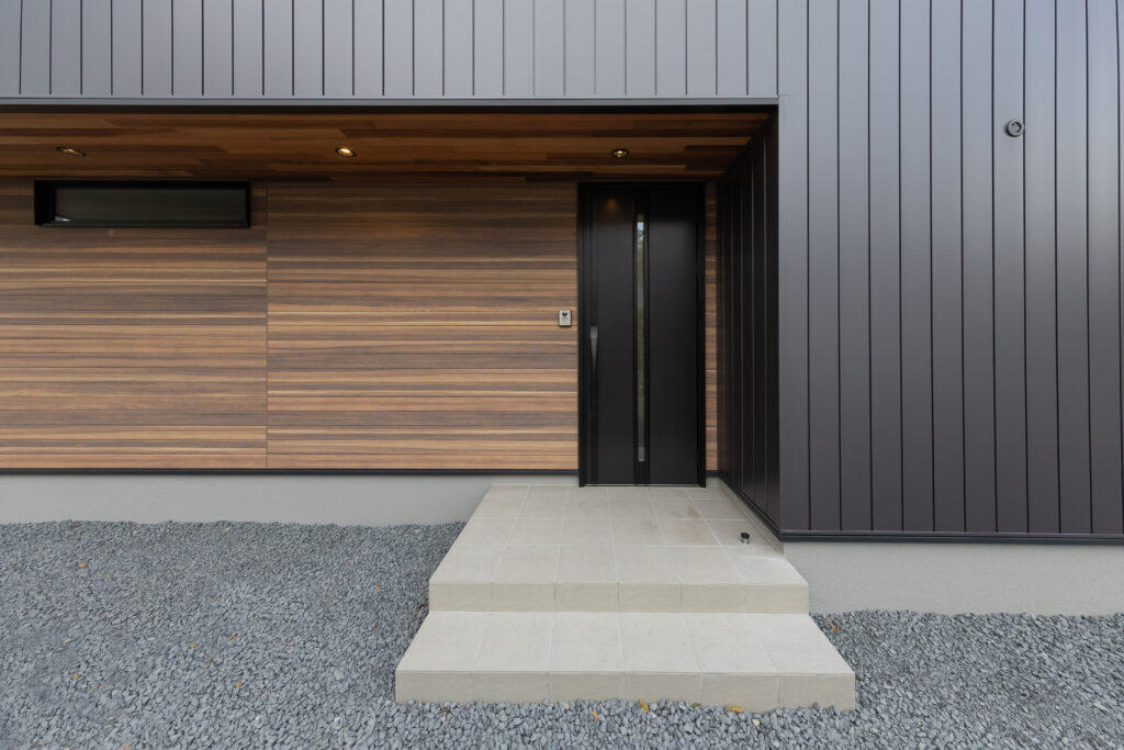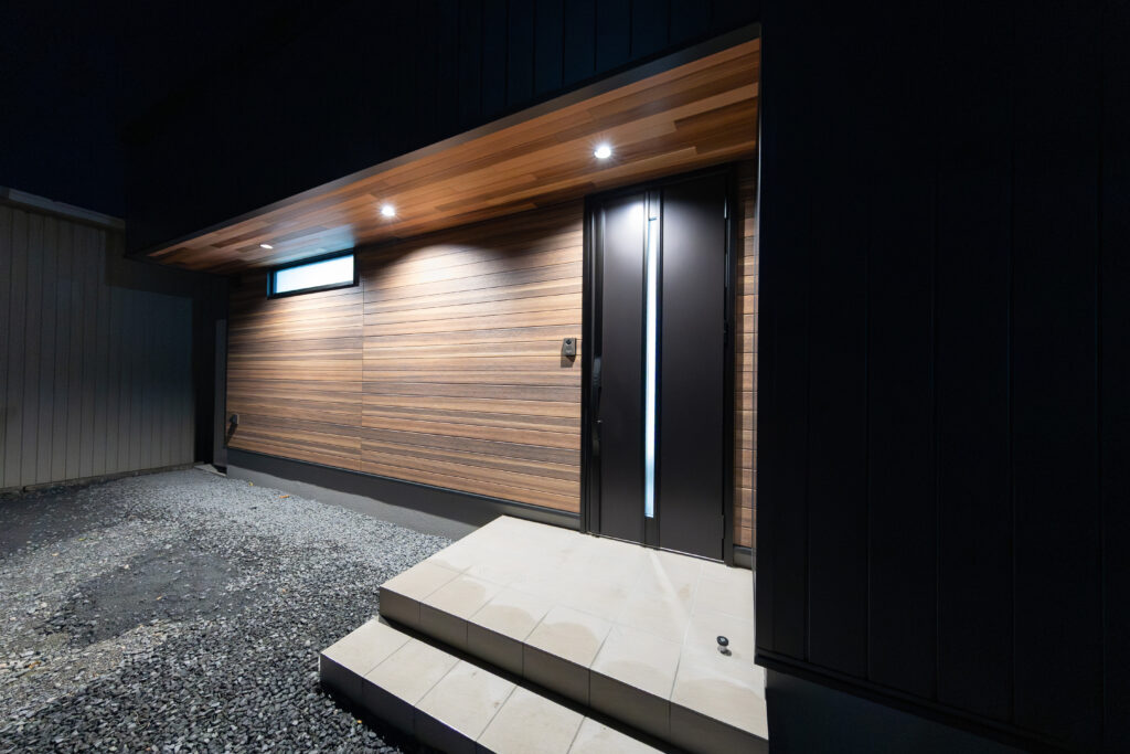 外観はダークカラーの外壁をベースに、玄関まわりに木目のアクセントを取り入れることで、落ち着きのある中にも温かみを感じるデザインに仕上げました。シンプルで飽きのこない外観は、周囲の自然環境にも調和する住まいとなっています。