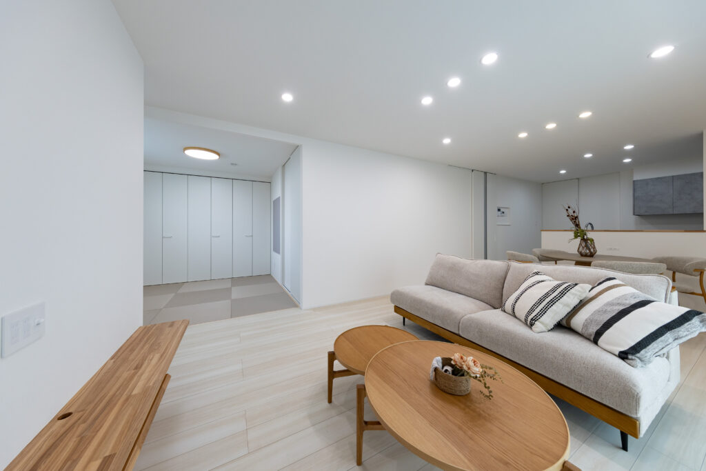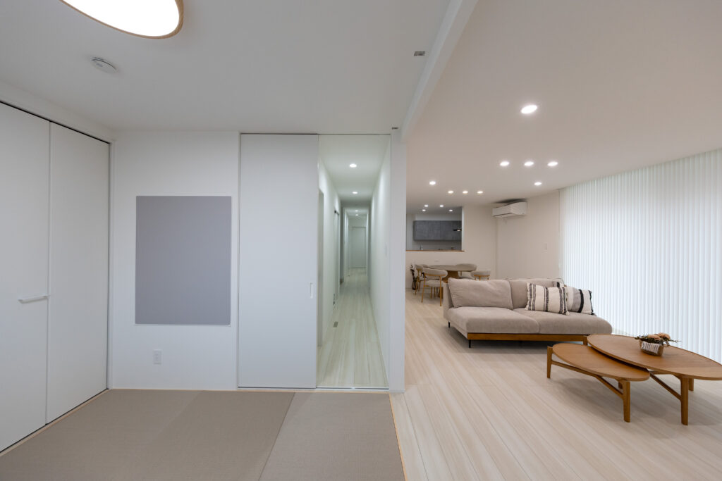 室内は、家族がゆったりと過ごせる開放感のあるLDKを中心にした間取り。リビングの隣には畳コーナーを設け、普段はリビングと一体的に広く使うことができ、来客時やお子様のお昼寝スペースとしても活躍します。ロールスクリーンで仕切ることで、個室のように使うこともできる柔軟な空間です。