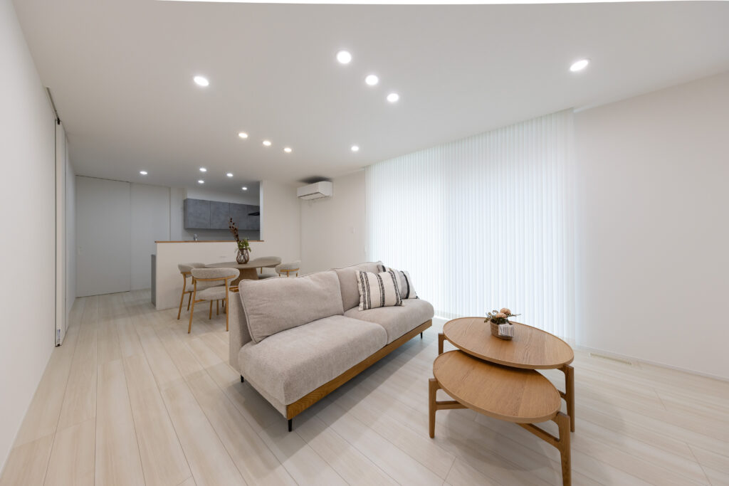 LDKは、家族が自然と集まる広々とした開放感のある空間に設計しました。大きな窓からやわらかな光が差し込み、明るく心地よいリビング空間を演出しています。