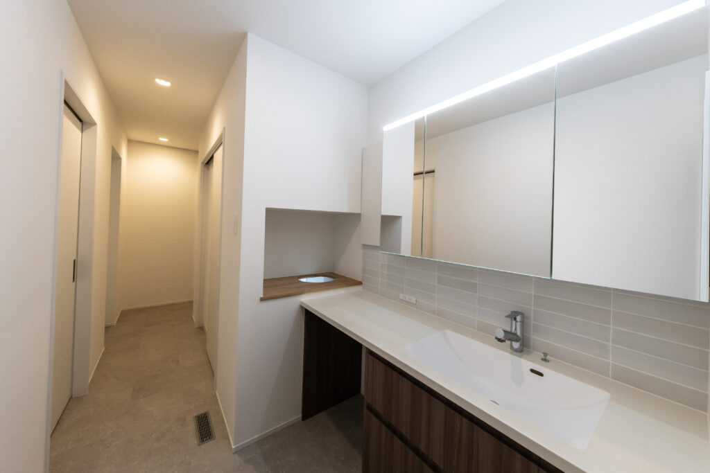 洗面化粧台の横には脱衣場につながる収納扉を計画。こちらに化粧水などを置くことにより、脱衣場からでも、洗面化粧台からでも同じものを移動させることなく使用することができます。