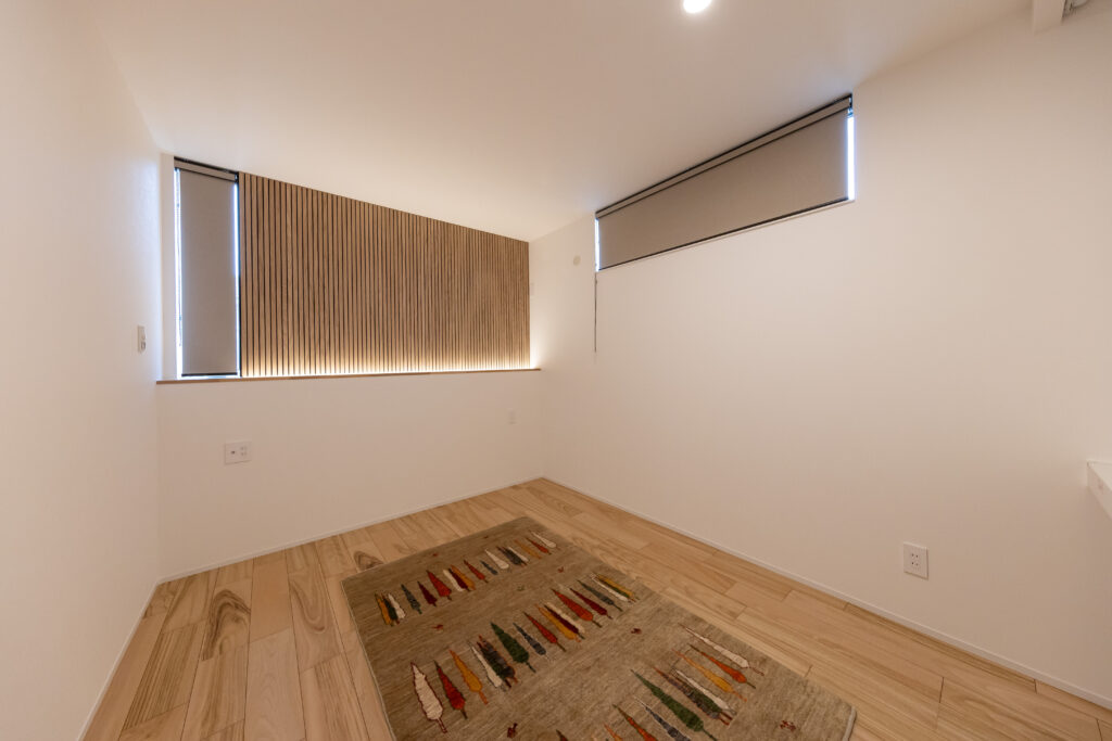 階段を上がった先に広がるのは、お子様の創造力を育む遊び心いっぱいの空間。 天井を**可愛い三角屋根の形状(勾配天井)**に仕上げることで、まるでおうちの中に小さなおうちがあるような、ワクワクする「こもり感」を演出しました。