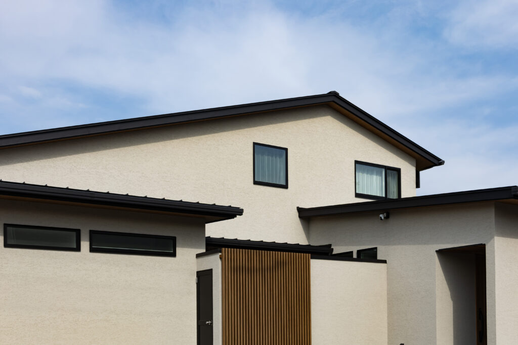 外観は、深みのある表情が魅力の**「塗装仕上げ」**。質感にこだわった外壁と中庭が織りなすコントラストは、まさに岡山県北で理想のデザイン住宅を形にした一棟です。