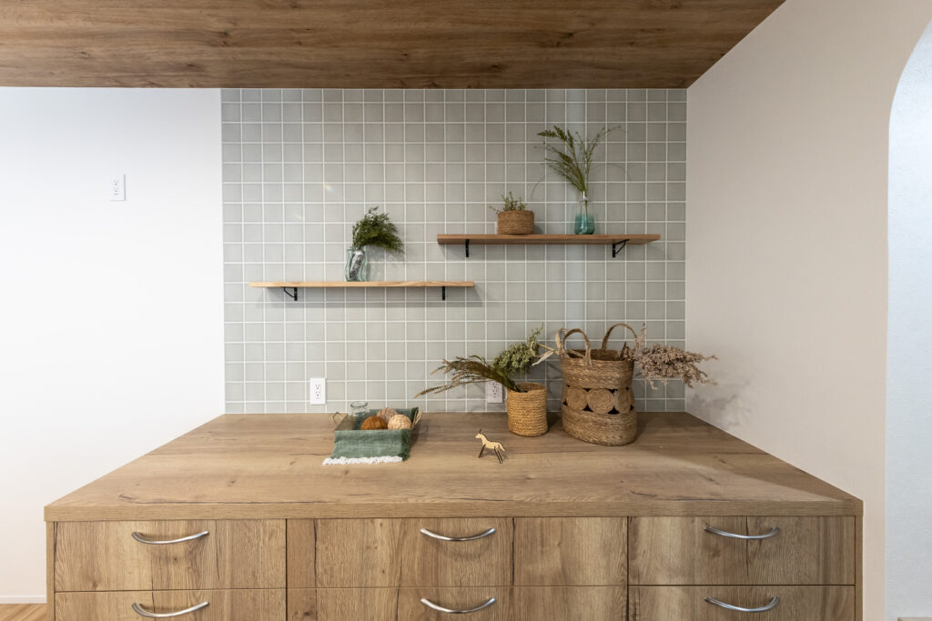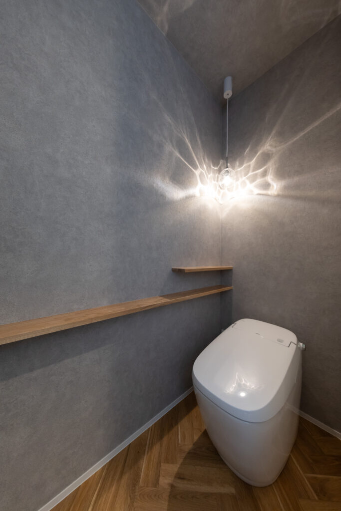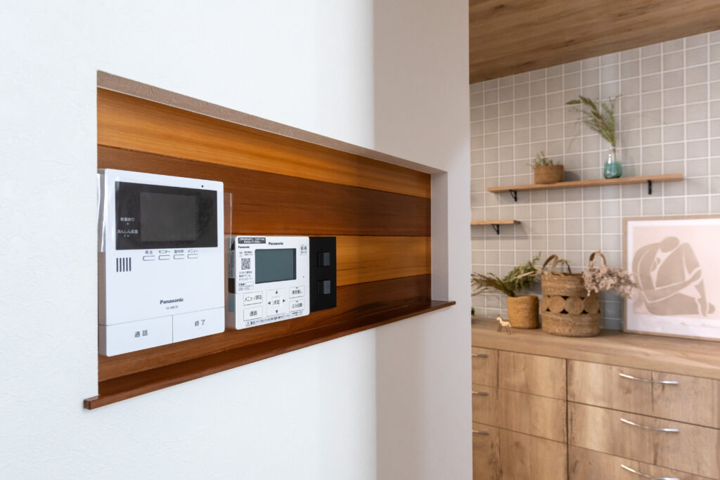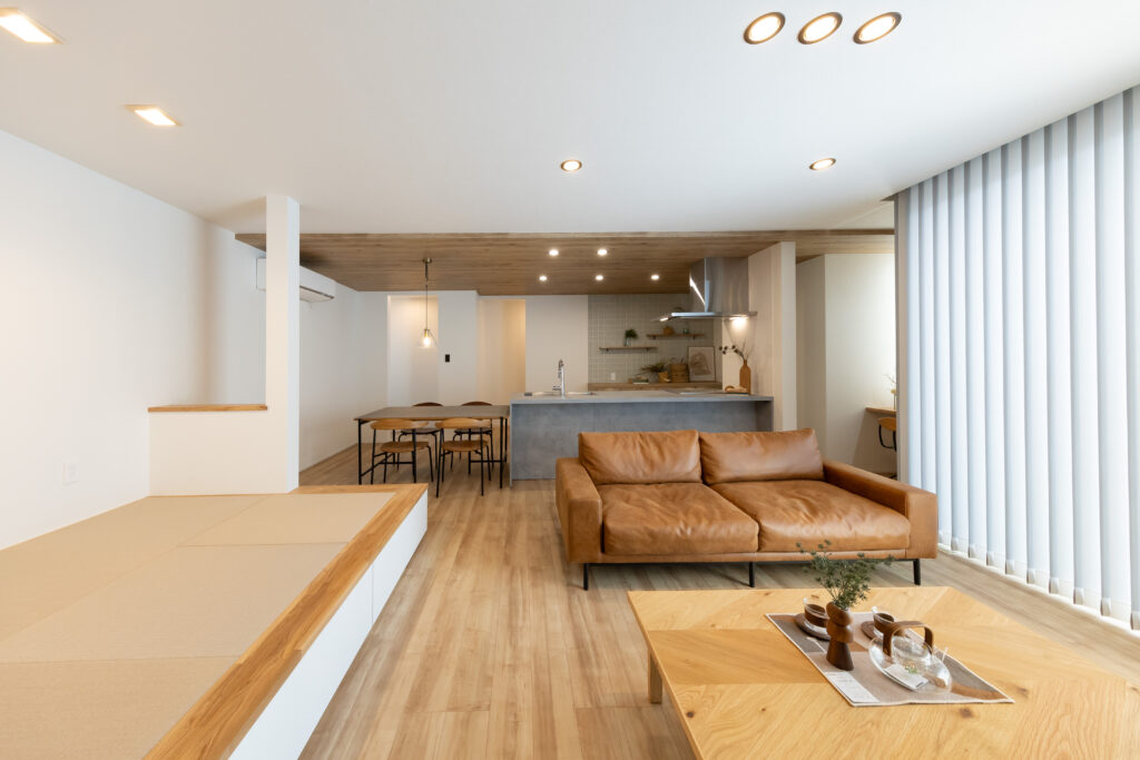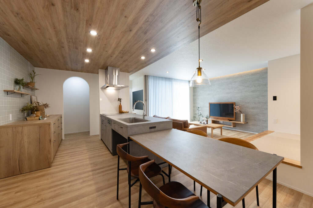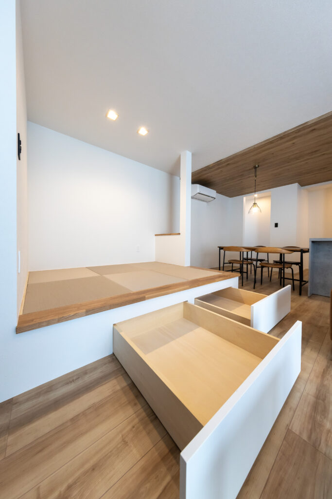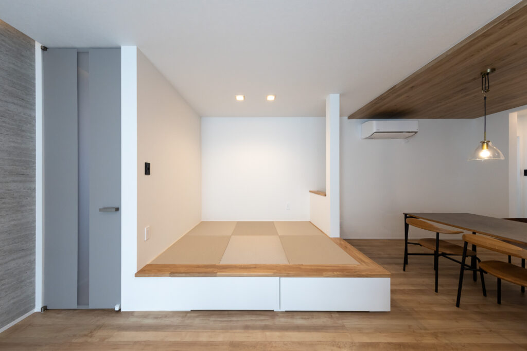 LDKの主役は、家具のような美しさを持つ**「グラフテクト(GRAFTEKT)」のキッチンです。 空間にスタイリッシュな統一感を与えます。 天井には温かみのある木目調クロスを採用し、視覚的な広がりと安らぎを演出。 さらに、リビングの一角には段差を利用した収納付きの小上がり畳コーナー**を設け、家族が自然と集まり、くつろげる空間に仕上げました。
