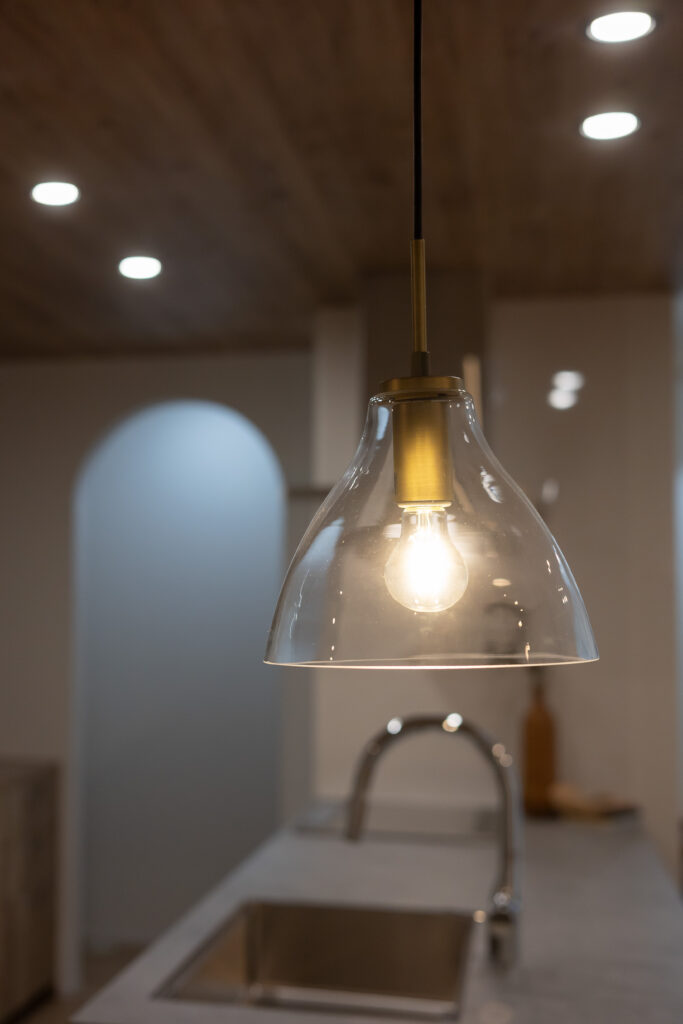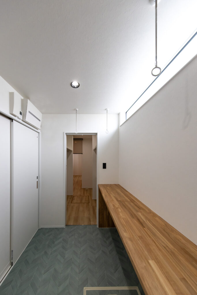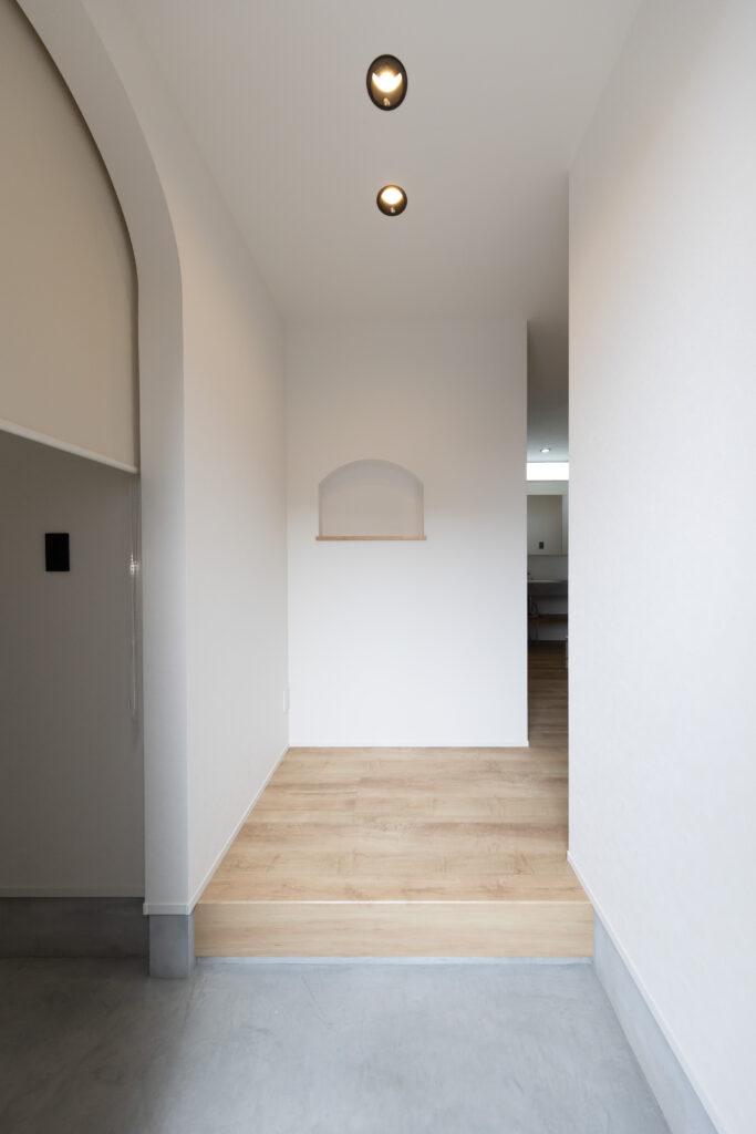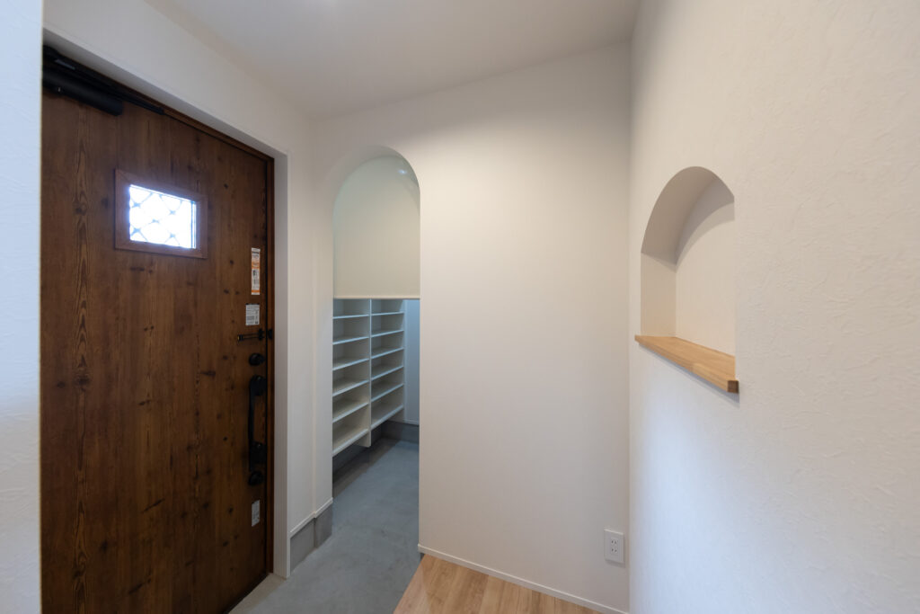 玄関ドアを開けると、柔らかな曲線を描くアーチ状の垂れ壁が迎えてくれます。 このアーチの先には大容量のシューズクロークを備え、生活感を隠しながらもおしゃれな空間をキープ。 玄関ホールから直接水廻りやLDKへアクセスできる効率的な動線は、日々の買い出しや帰宅時の負担を軽減します。 機能美と遊び心を両立させた、こだわりのエントランスです。