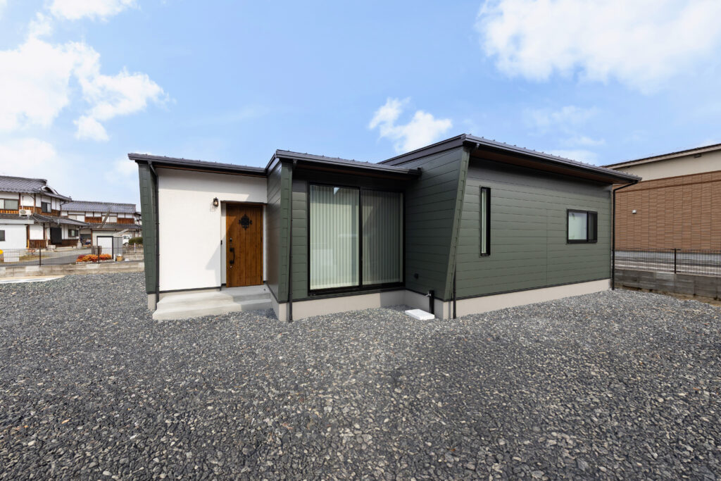 岡山県北の穏やかな景観に映える、モスグリーンのガルバリウムと白壁のコントラストが美しい平屋の邸宅です。