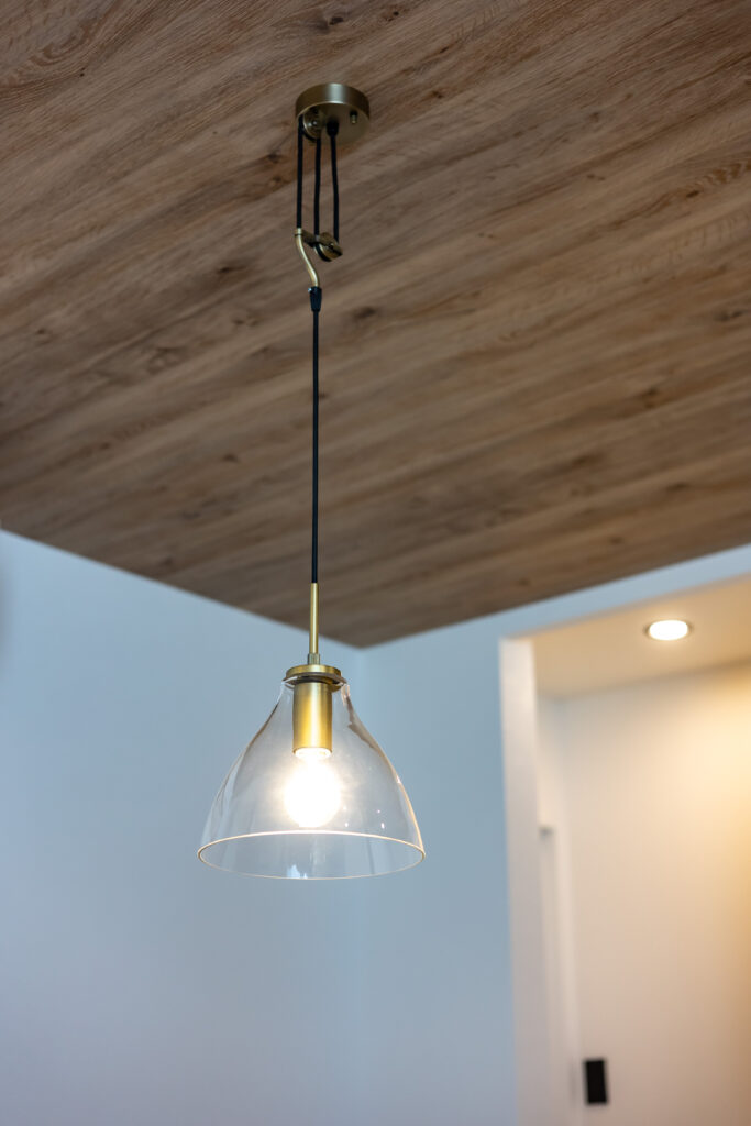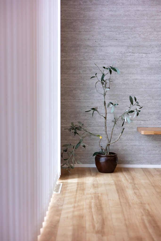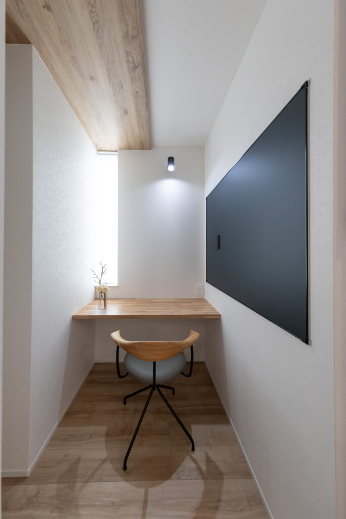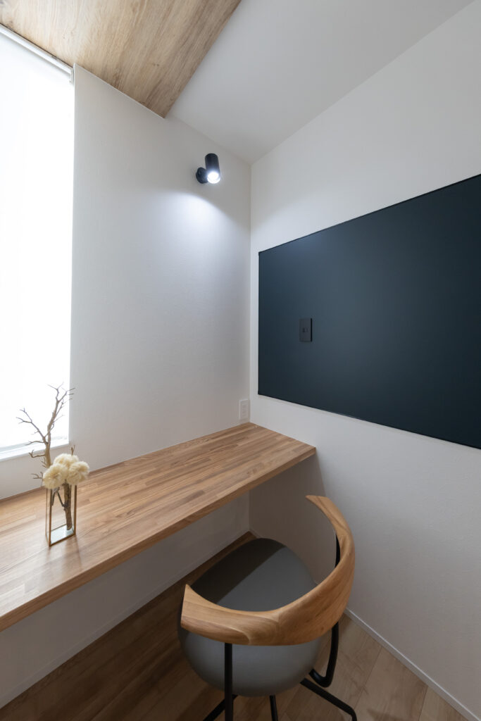 デスク側面には**ブラックのマグネットボードを設置。 メモを貼ったり、お子様のプリントを掲示したりと実用的なだけでなく、空間を引き締めるデザインのアクセントにもなっています。 さらに、頭上には木目の下がり天井とダウンライトを組み合わせ、夜には落ち着いた「大人の書斎」へと表情を変えます。 岡山県北のゆったりとした時間の中で、仕事も趣味も捗る、平屋暮らしの新しい提案です。