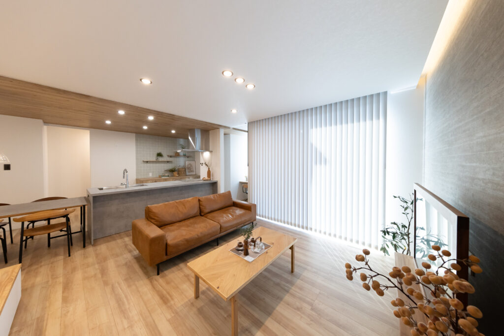 外観のシャープな印象とは対照的に、室内は木の温もりと洗練されたグレーの素材感が調和する、心地よい空間が広がります。