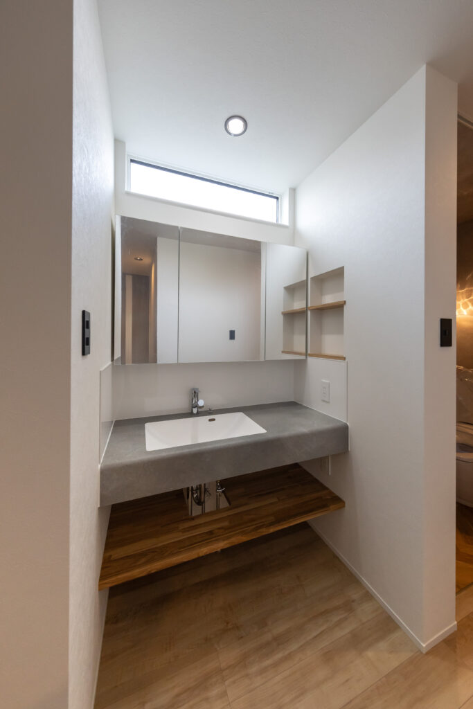 毎日使う場所だからこそ、美しさと使い勝手にこだわりました。 洗面スペースは、ワイドな鏡と無機質な質感が印象的な造作風のデザインを採用。 「洗う・干す・しまう」の動線をコンパクトにまとめ、共働き世帯にも嬉しい家事ラクな住まいを実現しました。